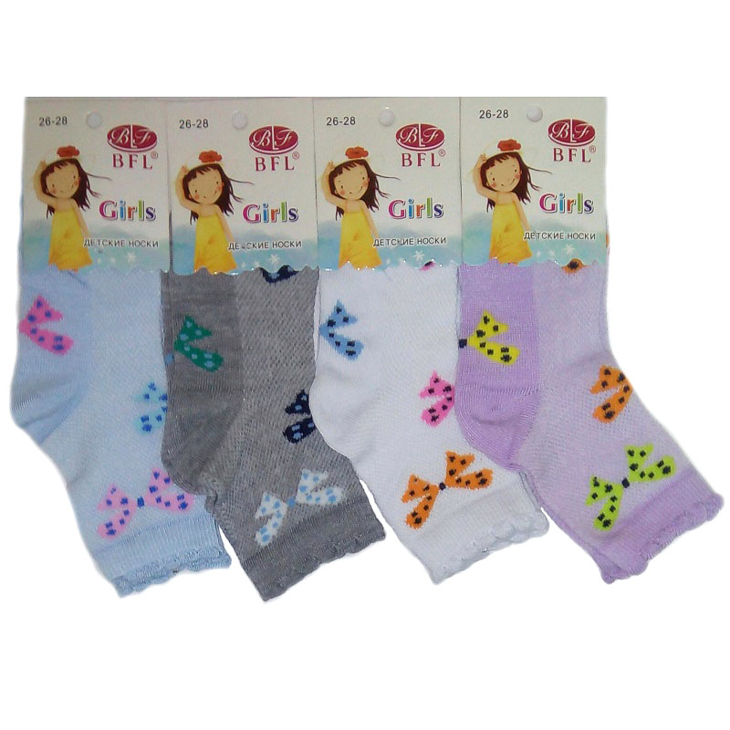 Носки на девочек выполнены из хлопка с добавлением эластана. Подошва гладкая, верх в сеточку, на паголенке рисунок, резинка двойная и ажурная.